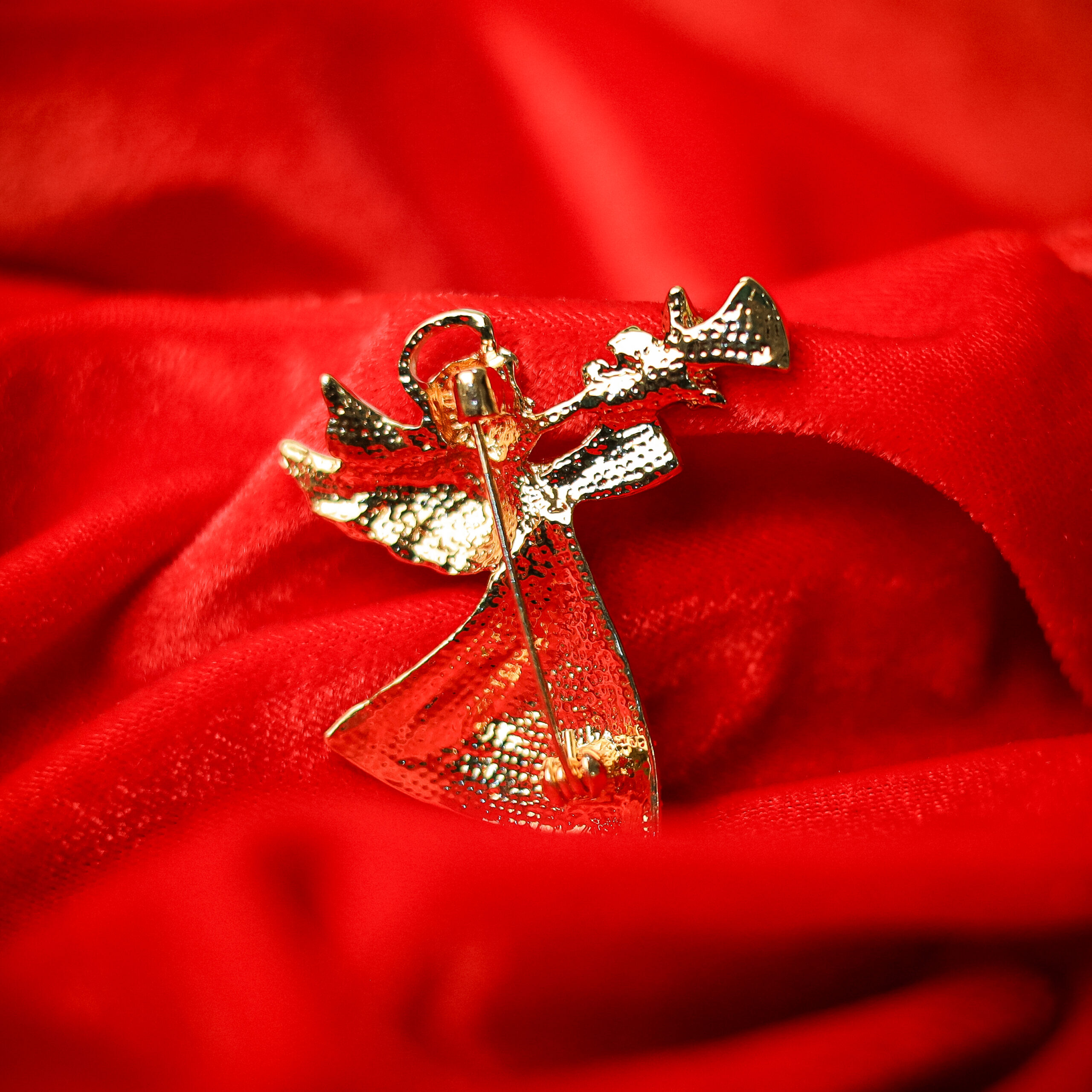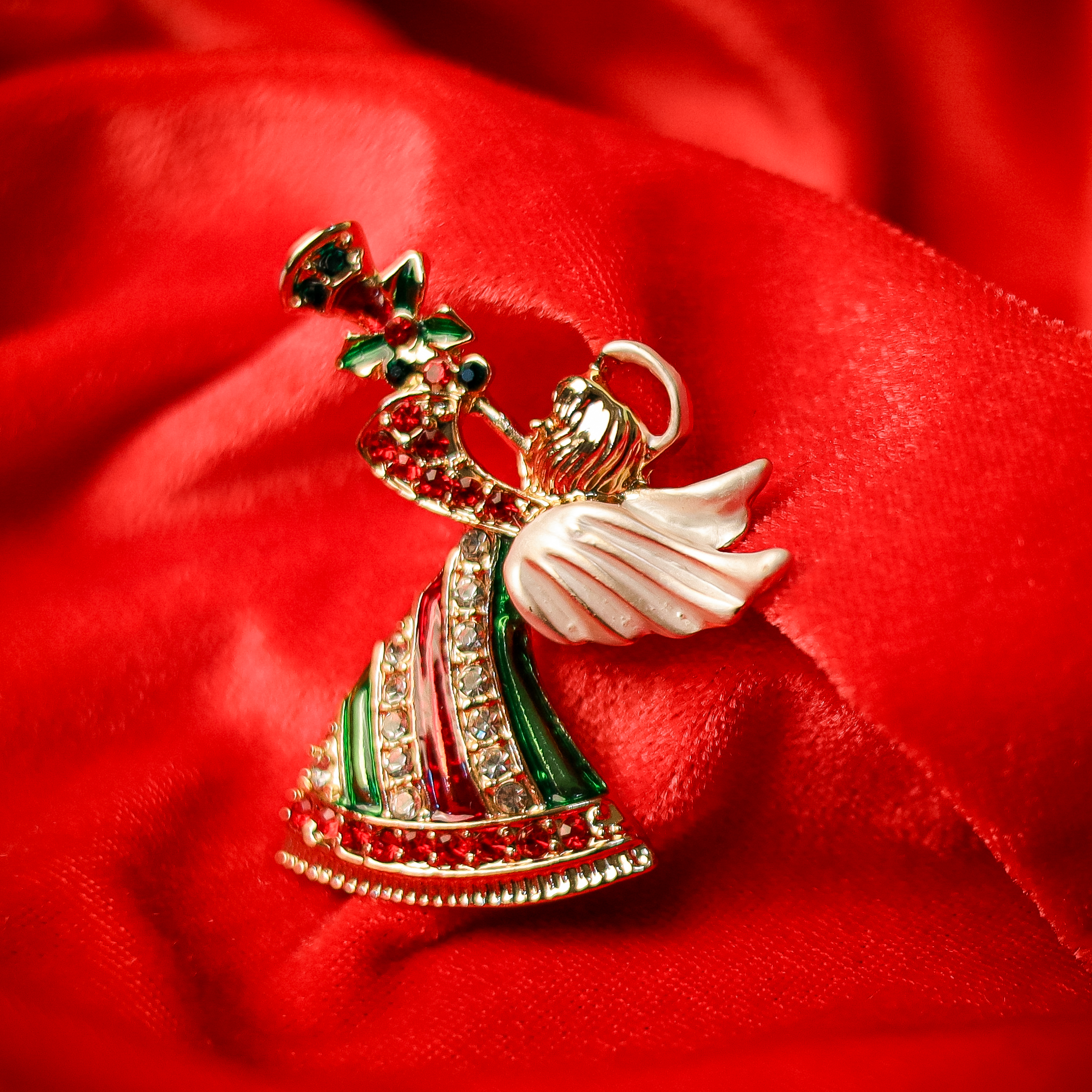 Small Description: Angels we have heard on high… and now you can wear one! This enchanting Christmas angel brooch is a celestial celebration of the season, adorned in a dazzling striped gown of red, green, and sparkling crystal stones.