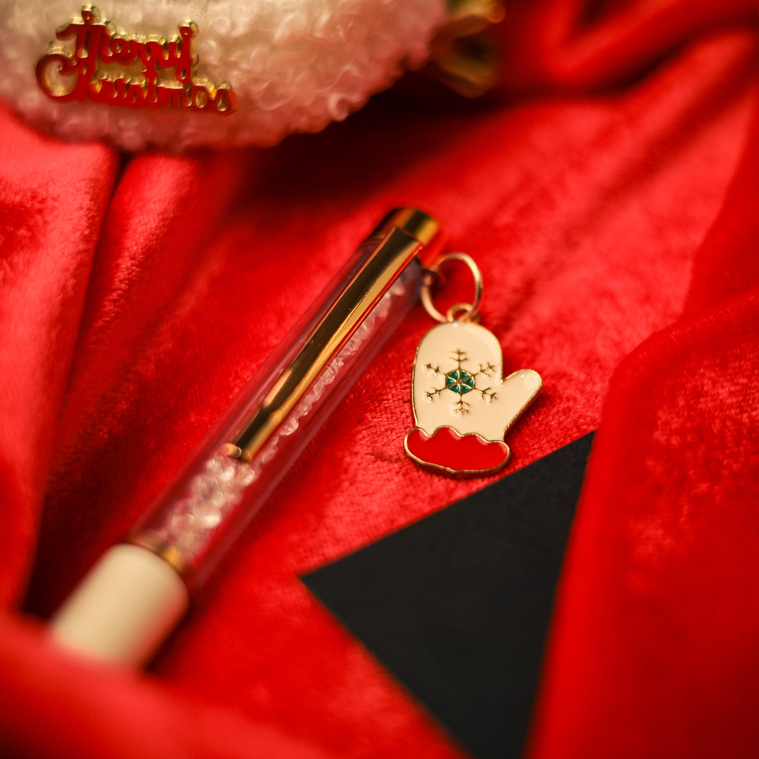 Description: Sophisticated white glove with golden snowflake embellishment graces a rose gold glitter pen combining refinement with festive joy.