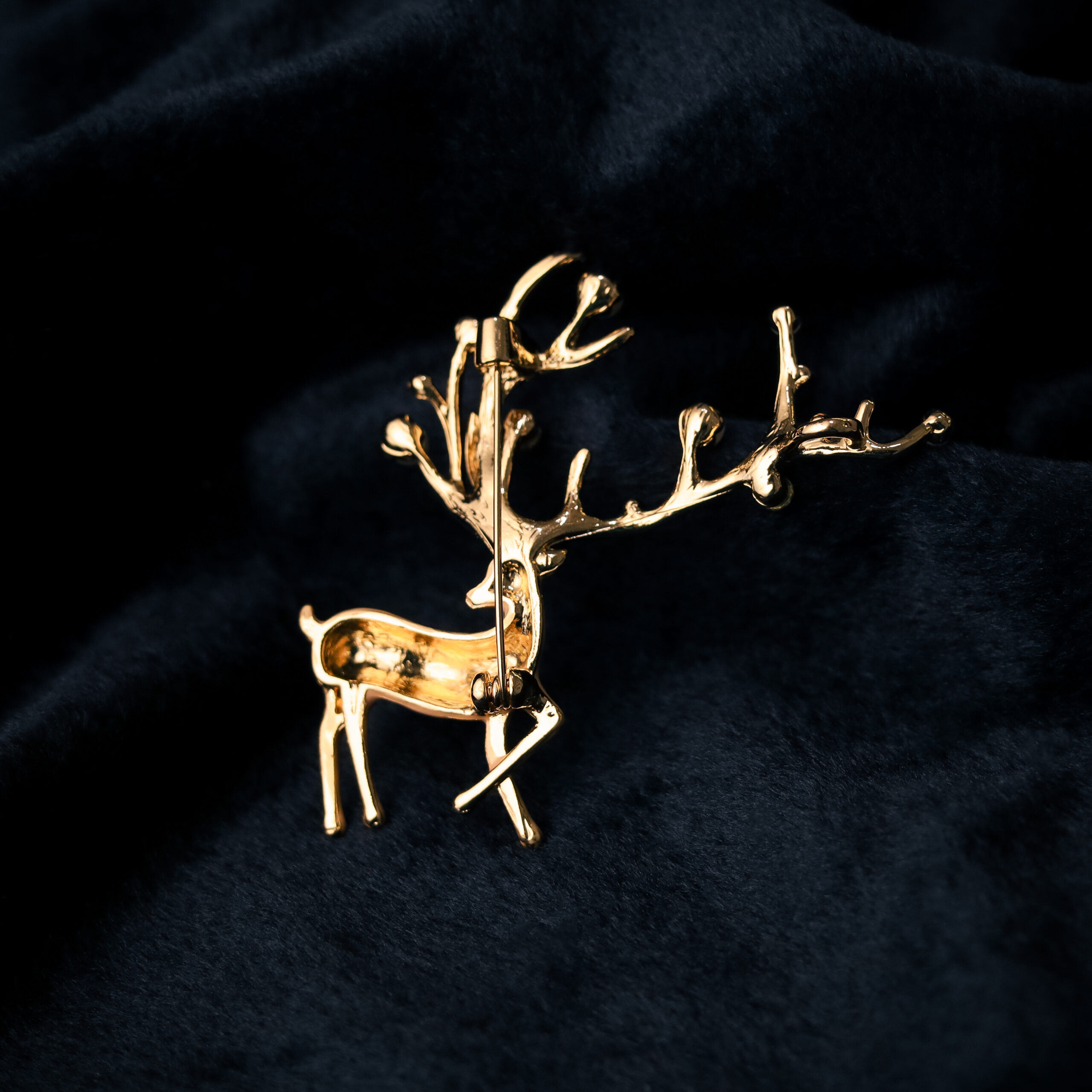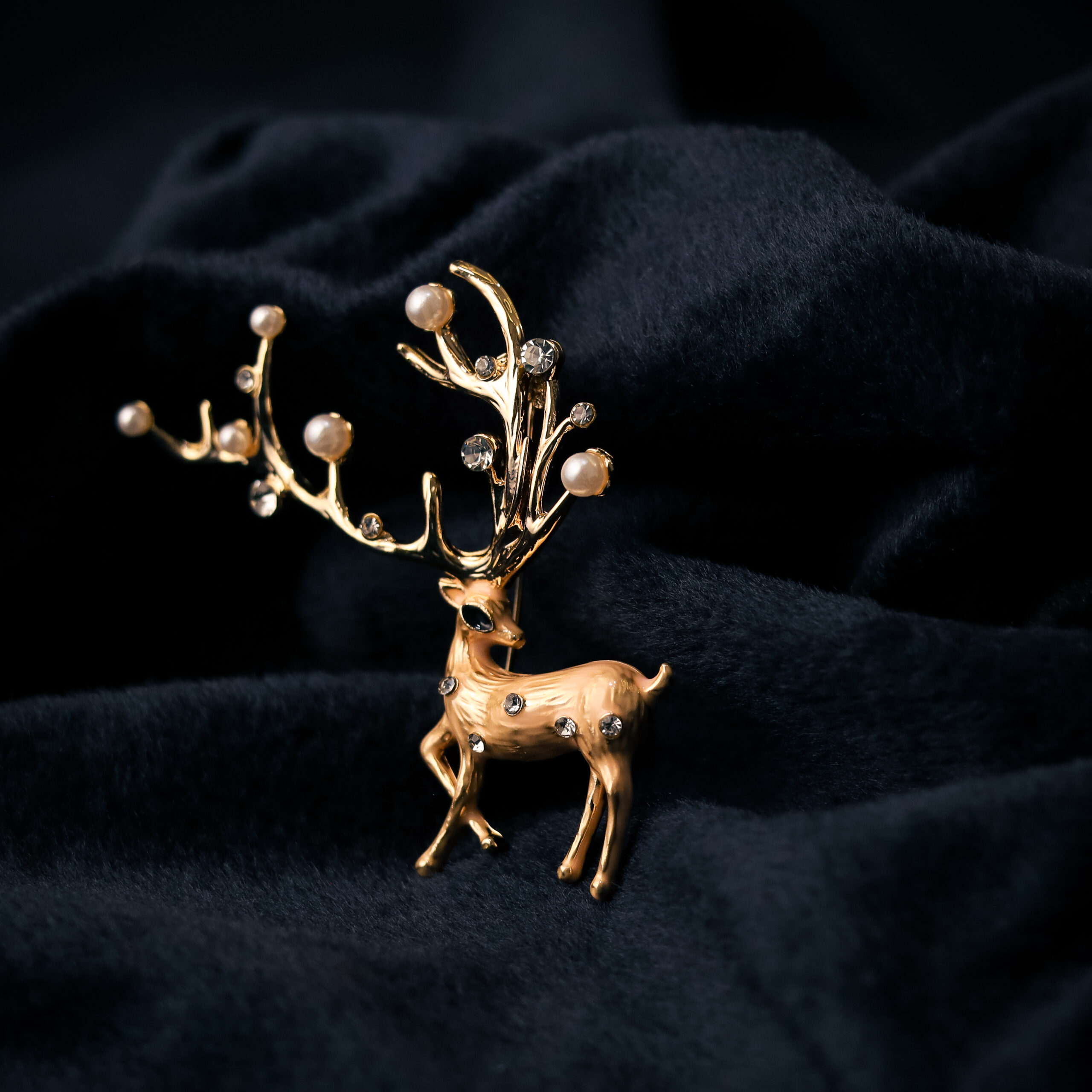 Small Description: Dashing through the snow in the most elegant way possible! This golden reindeer brooch is pure Christmas sophistication, featuring graceful branching antlers adorned with lustrous pearls and sparkling crystal accents that shimmer like freshly fallen snow.