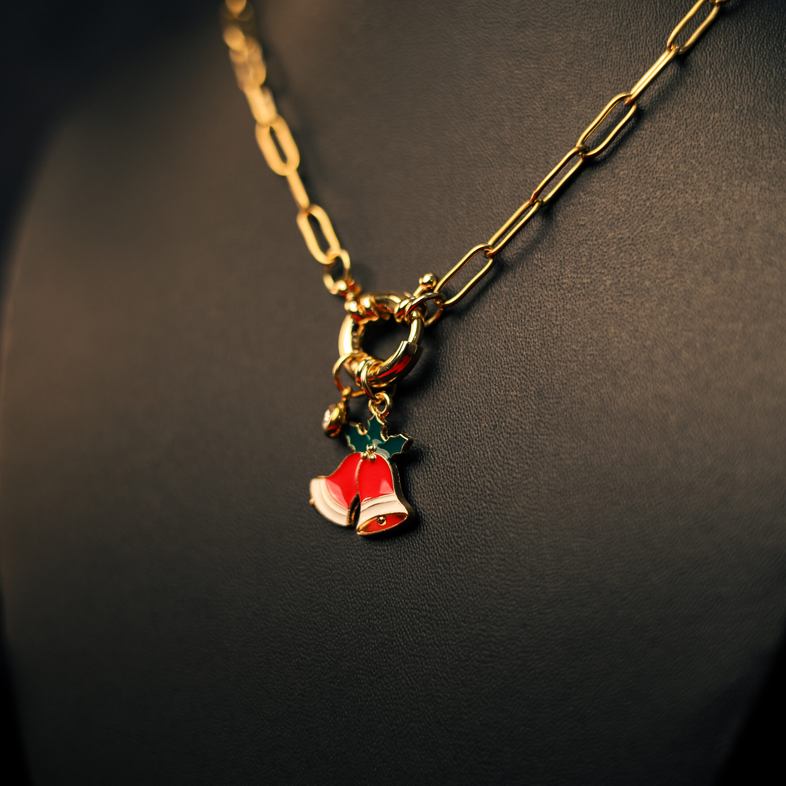Description: Red and white Christmas bells with green holly accent on bold gold paperclip chain captures the sound and spirit of the season.