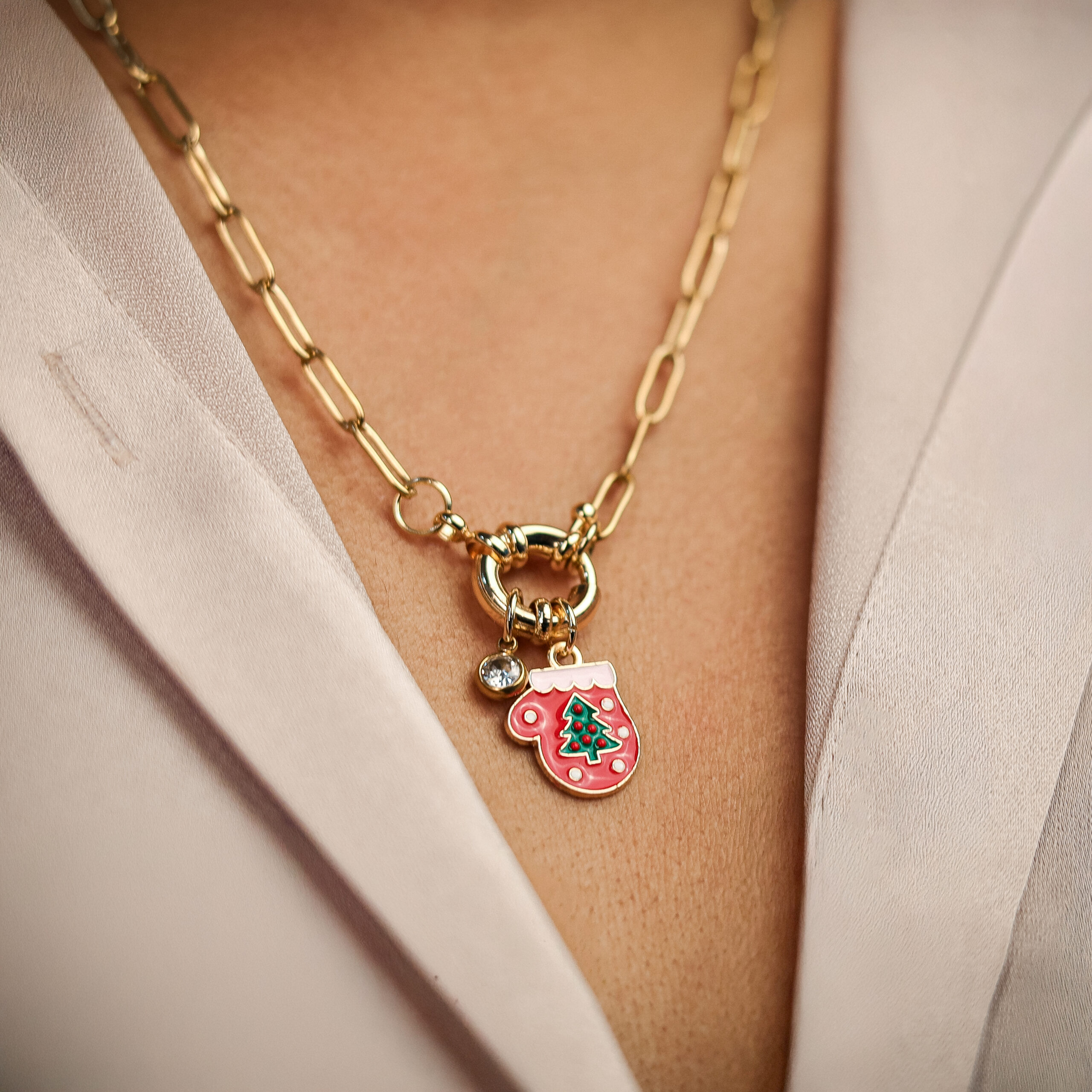 Description: Delicate gold paperclip chain featuring red enameled glove bell charm with a green Christmas tree for elegant holiday style.