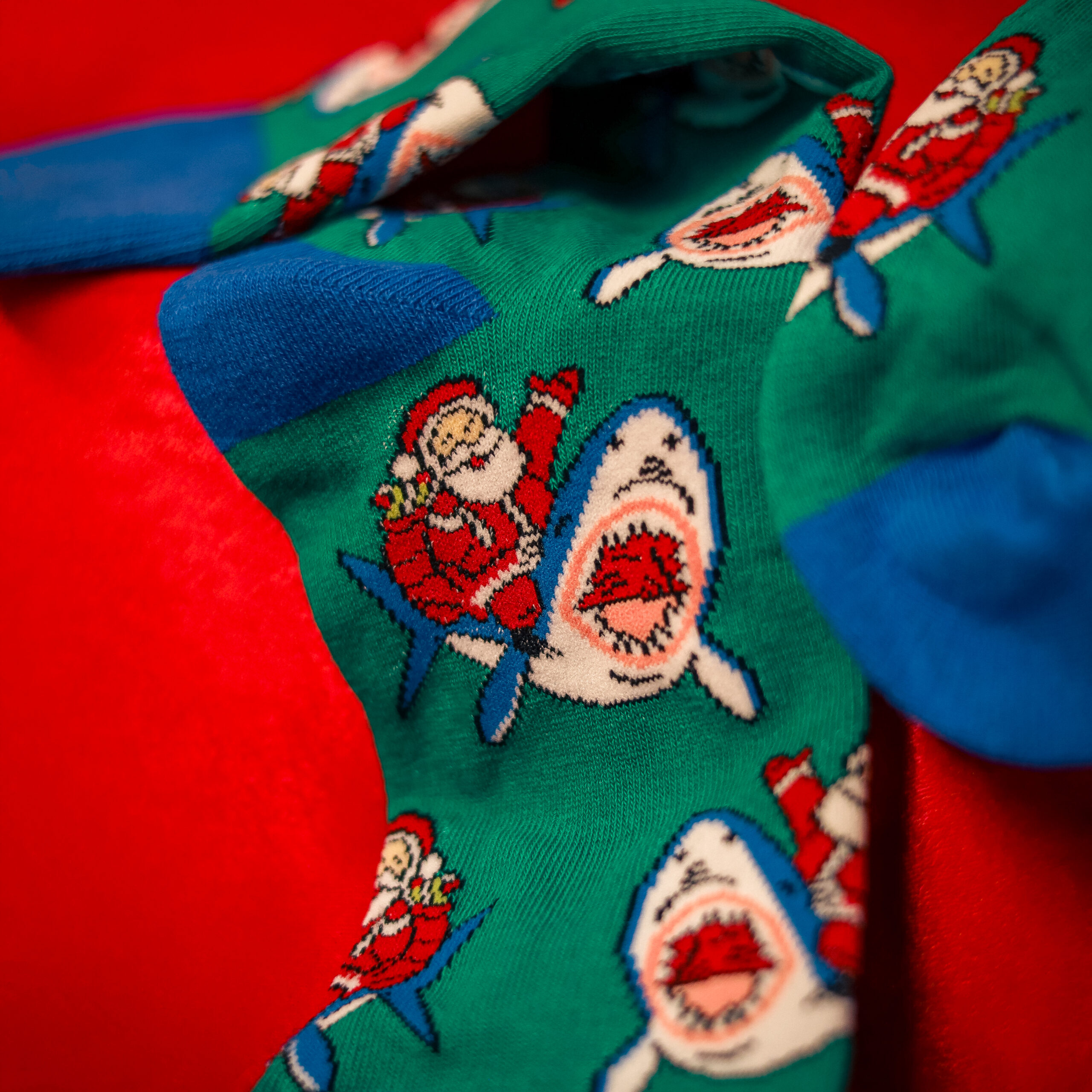 Description: Fun teal socks featuring tropical surfing Santas bring playful beach-themed holiday twist to traditional Christmas celebrations.
