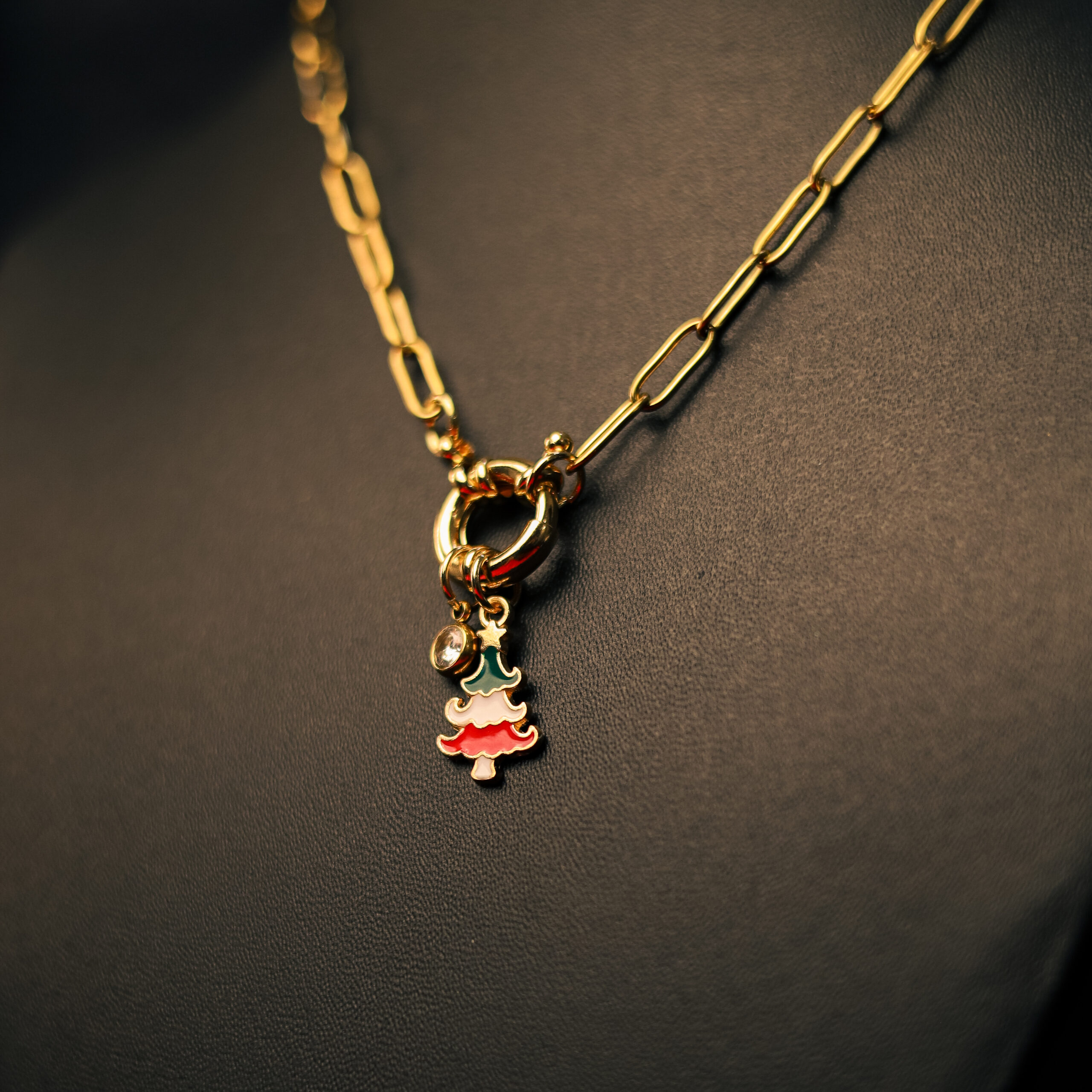 Description: Colorful layered Christmas tree in red, white, and green enamel on statement gold chain brings cheerful festive style and dimension